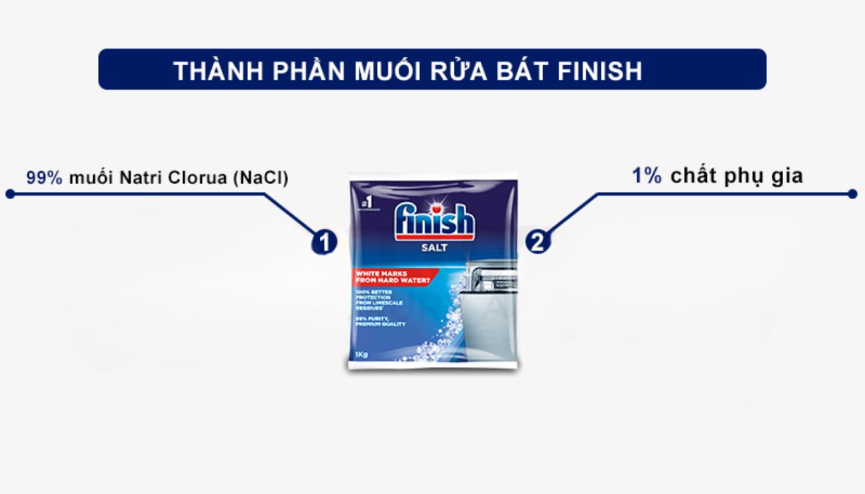 Muối rửa bát Finish 1kg chứa 99% Natri Clorua (NaCl) và 1% phụ gia hỗ trợ, đảm bảo hiệu quả tối ưu khi sử dụng.